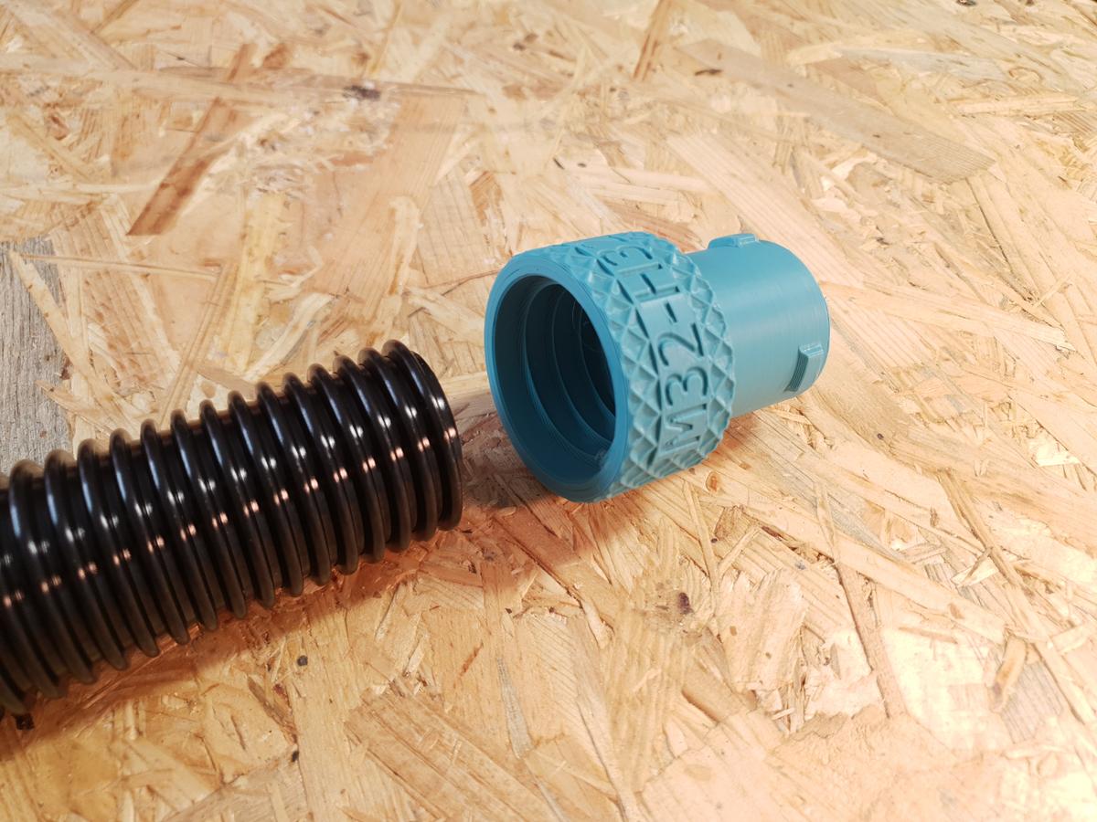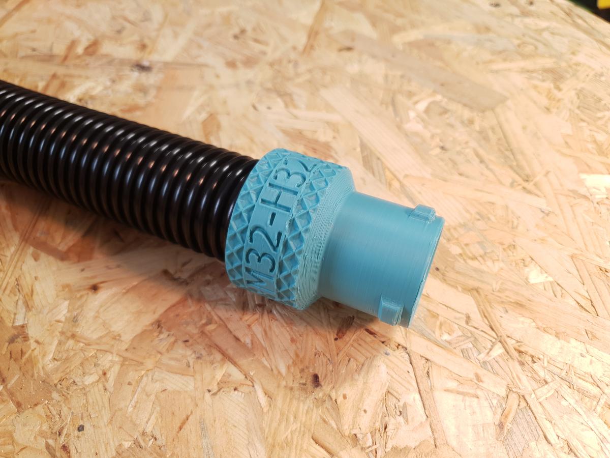Der M32-H32 besitzt auf der einen Seite den Anschluss für deinen handelsüblichen Staubsaugerschlauch mit 32 mm Innendurchmesser und ca. 40 mm Außendurchmesser. Auf der anderen Seite bietet er den passenden Steckanschluss für den F32-H32 oder andere osVAC-Adapter.
